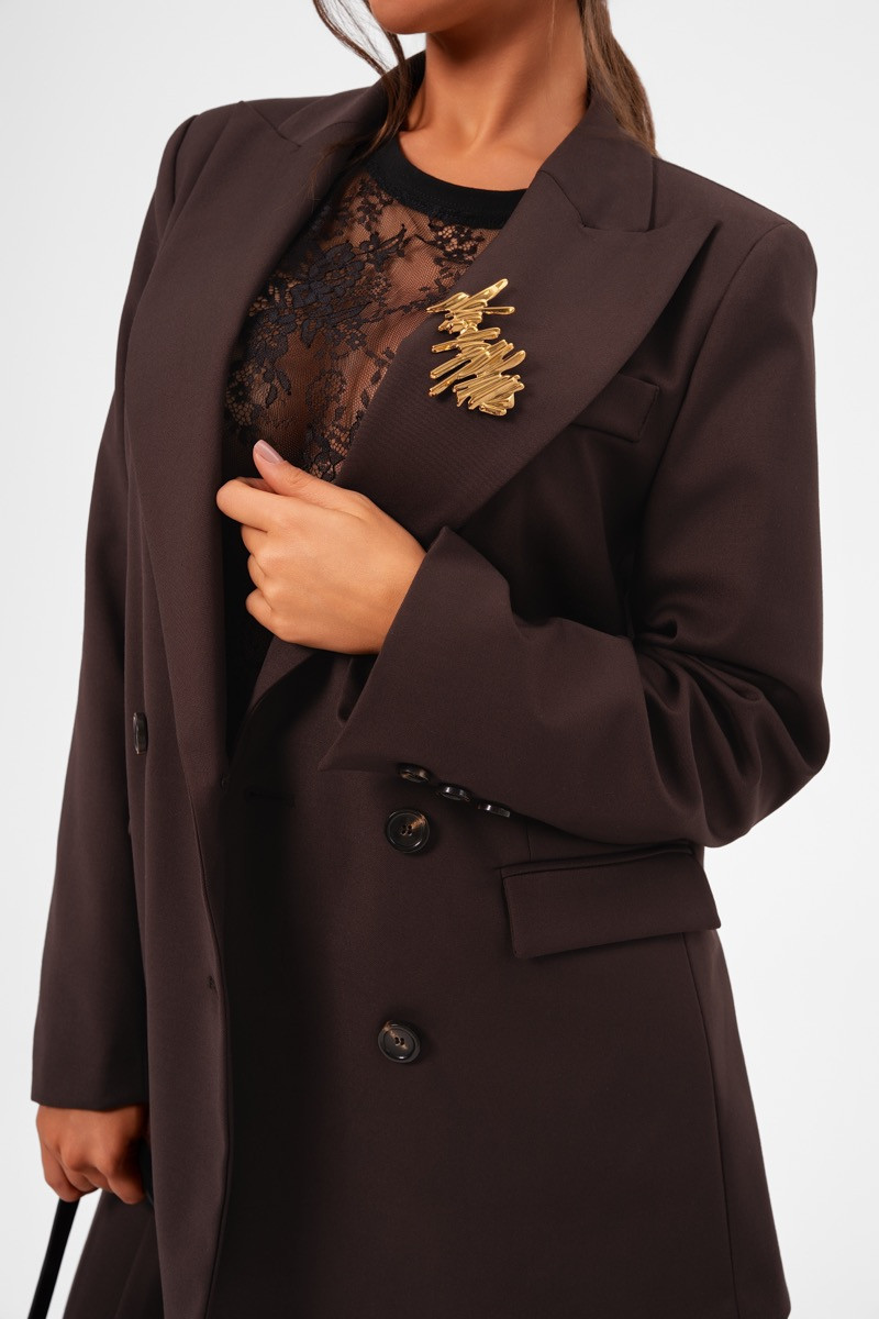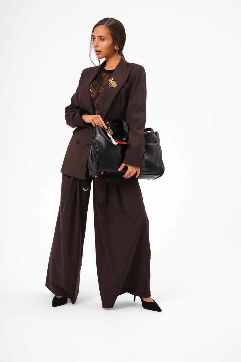 Елегантен и дръзък костюм в шоколадов нюанс, състоящ се от двуредно сако и широк панталон с висока талия. Силуетът е едновременно структуриран и флуиден – съчетава сила и изисканост в перфектен баланс.