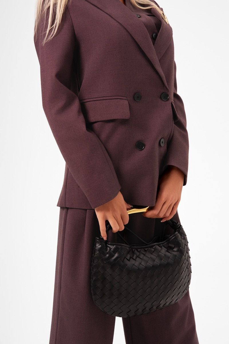 Костюм от три части, съчетаващ съвременна елегантност и изтънчена женственост. Състои се от структурирано сако, прав панталон и къс топ с асиметрична линия. Изработен от висококачествена материя с фина текстура, която придава лек обем и комфорт. Перфектен избор за модерна, уверена визия.Умален, размер М отговаря на С.