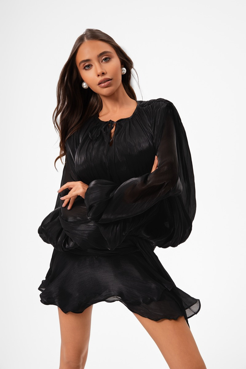 Къса черна рокля от ефирна, сатенена материя с фин блясък и панталонки в тон. Свободната линия създава леко, елегантно движение, а панталонките осигуряват комфорт и съвременна визия. Идеален баланс между женственост и модерен силует.