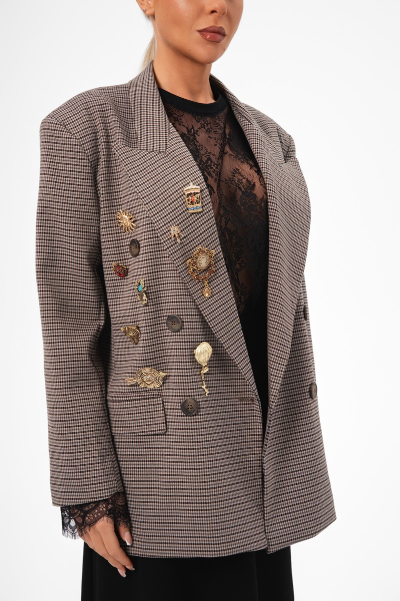 Сако в кафяво каре с изразен силует и декоративни брошки, вдъхновени от винтидж стилистика. Стил, който пренася класиката в съвременното – елегантно, уверено и неподвластно на времето.