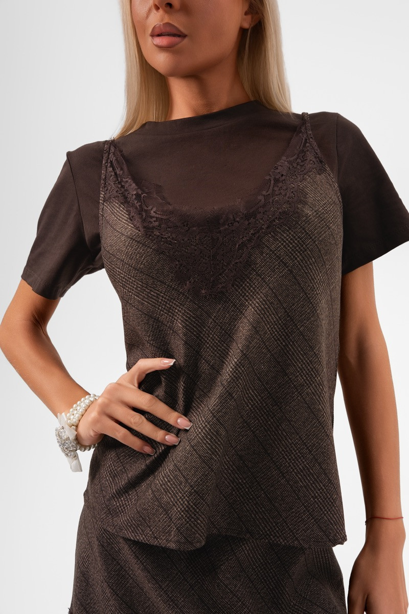 Двукомпонентен комплект в кафяво каре, който обединява модерна визия и класическа елегантност. Състои се от топ с къс ръкав и изчистена линия, върху който е наслоен лек бюстиен силует с дантелен завършек, и къса пола със същия десен, декорирана с фина черна дантела по подгъва.
